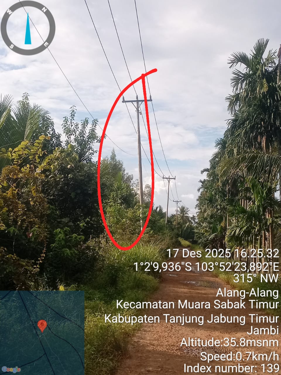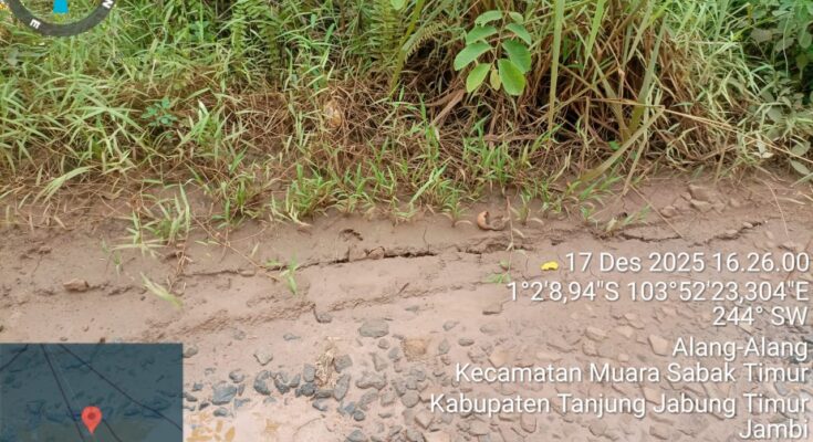 Detiknews.co|Tanjab Timur – Kondisi badan jalan poros Desa Alang-Alang, Kecamatan Muara Sabak Timur, Kabupaten Tanjung Jabung Timur, tepatnya di sekitar jembatan Parit Pokko, kini dinilai rawan dan membahayakan pengguna jalan. Retaknya badan jalan diduga telah menyebabkan tiang listrik di lokasi tersebut semakin condong ke arah sungai.